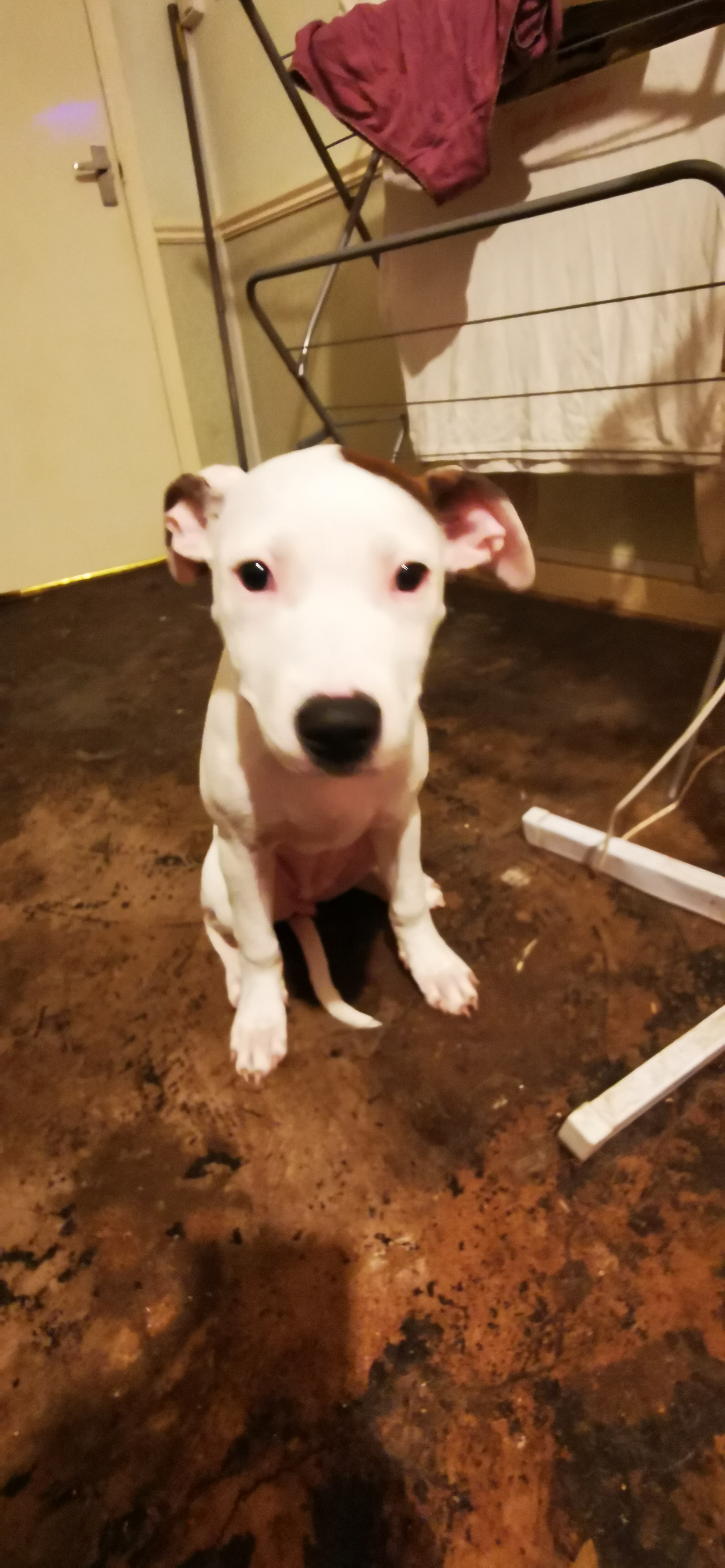 This is sky, she is a staffy cross, she is good with other animals and children, she is learning her basic training and is up to date with fleaing and worming, he is microchipped, she is loving puppy, she likes to have a cuddle but she fine just having a wander around, shes never been crate trained and unfortunately I can't keep her, she would make a brilliant family pet I need her rehomed as soon as possible, genuine reason for sale. Any other questions please feel free to message or call me to discuss further.