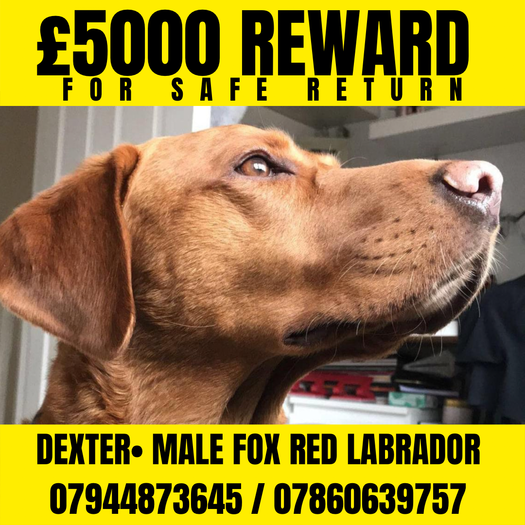There is a £5000 reward for Dexter's safe return. He is a huge member of our family and we miss him more than anything.