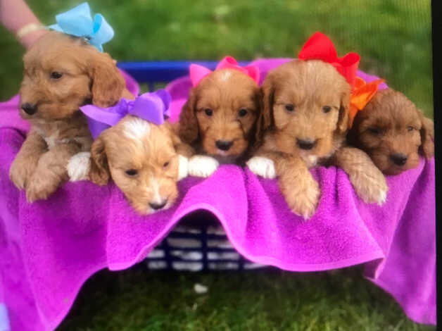 Very proud to announce my beautiful litter of 8 fox red cockapoos 5 females and 3 males,mum is our beautiful pet cocker spaniel Millie she has the sweetest temperament and she's amazing with children, dad is a handsome toy poodle stud dog. All pups are well socialised and have been brought up in our busy family home,there ready to leave for there forever loving homes on 31/03/2021 they have been health checked and first vaccination has been given they will leave with there vaccination card and health check, there all up to date with worming and flea treatment,they will also come with a blanket with mums and sibling scent on, video calls to see mum and pups are welcome a £300 non refundable deposit Will secure your choice of puppy please call me for further info