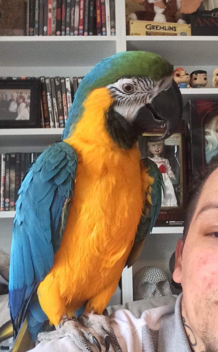 4 years old (hatch date 20th August) . He was hand reared and is tame. We are sadly having to rehome our macaw as our three young children are scared as he is so big. It’s a sad rehome as he has a lovely temperament. He likes to dance and he talks. Comes with very large cage (cage size H-5ft,70cm. W-3ft,40cm. D-2ft,32cm. ), he also comes with food and toys. We also have a nebuliser that he came with also if you want that, it has never been used and is brand new. He needs to go to a forever home.