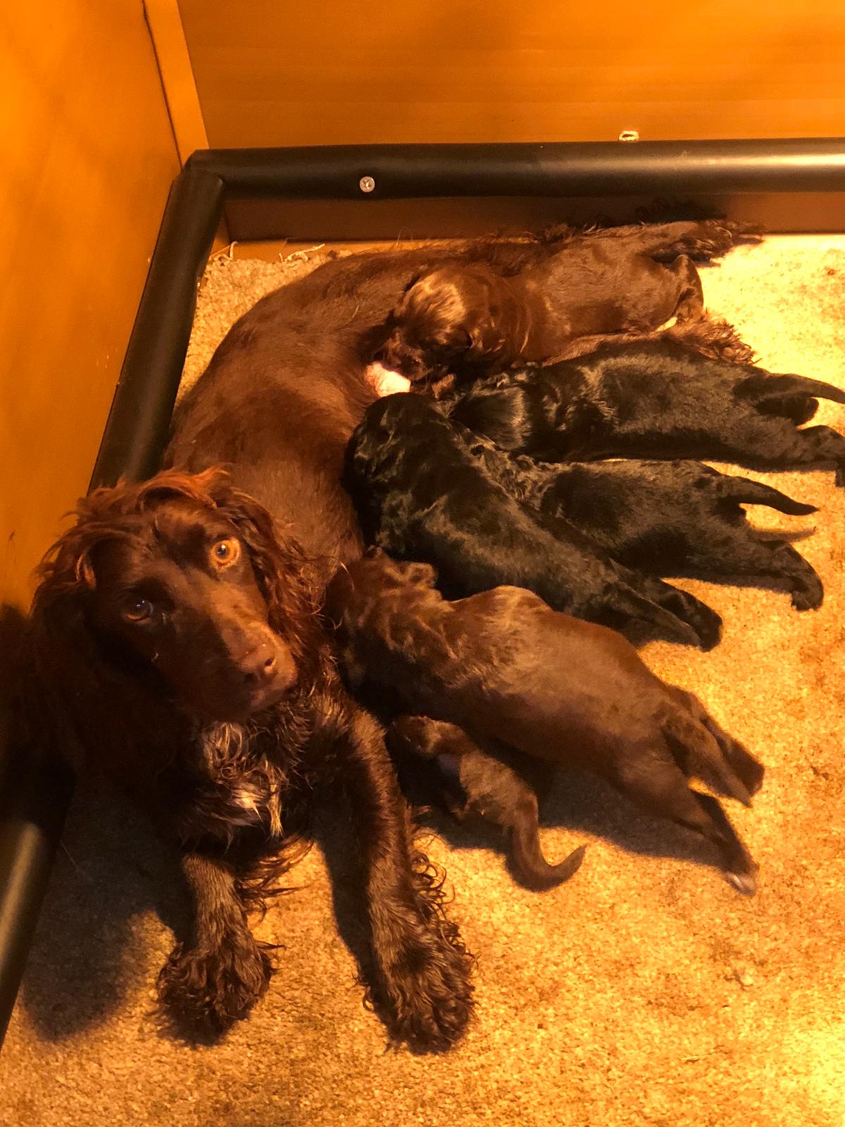 Here we have a lovely little of small working type cocker spaniels we bred this litter to keep a puppy back for our selfs our gorgeous girl waffles had a stunning litter of 6 lovely strong boys mum works and is our family pet her first litter she is just coming three she is very small and stocky Great example of a small working type cocker spaniel dad is also a small working type cocker spaniel he is kc registered and have a copy of all he’s pedigree mum is liver and dad is black we have 2 black boys available and 3 liver boys all pups will be vet checked microchiped and have first vaccinations will be wormed and Deflead pups will be wormed and waited every 2 weeks. Pups will be ready for there new homes on the 18th of July will make great family pets or great workers five star homes wanted thanks Please call on 07478435993