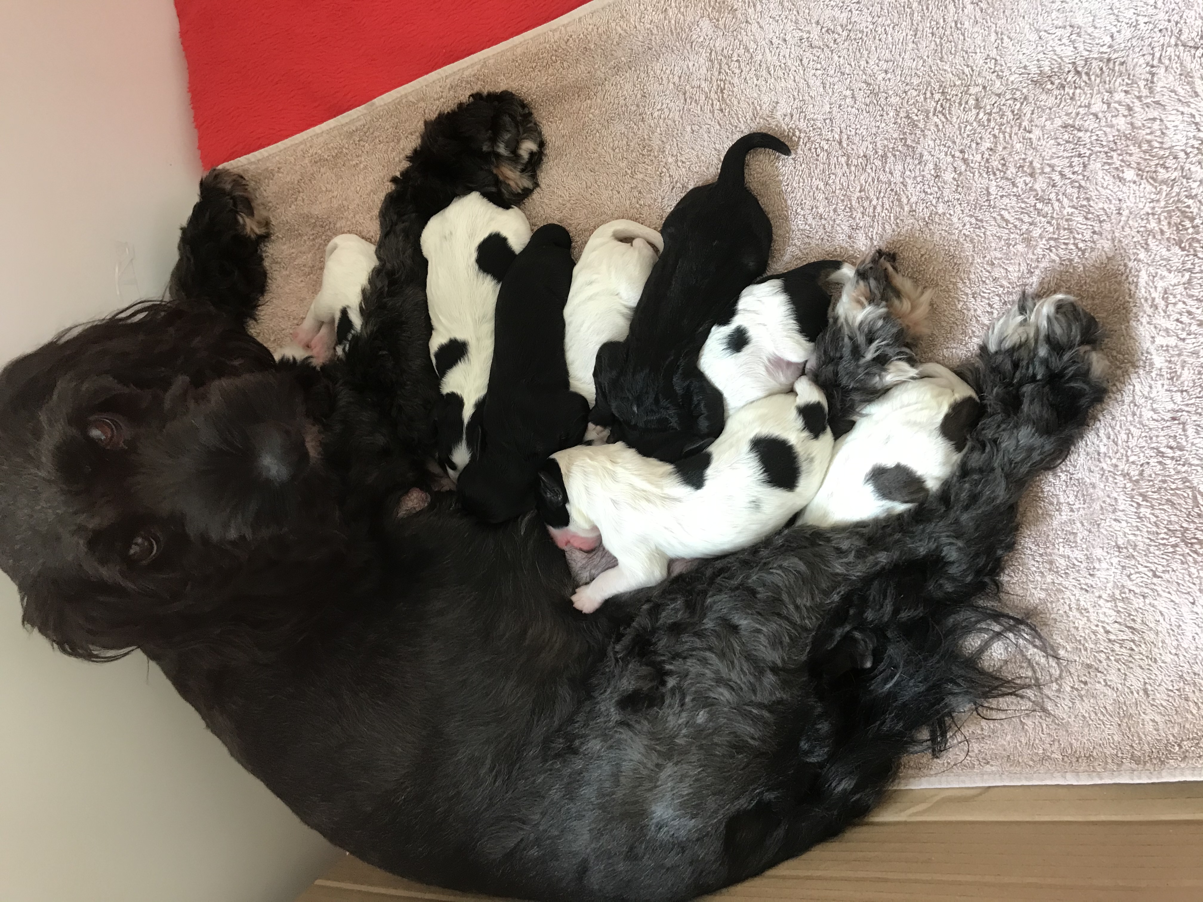 We are happy to announce that our cockapoo has given birth to 8 beautiful puppies. We have remaining 5 boys(black and white) and 1 girl(black). Puppies have been microchipped, vaccinated, wormed, flead and have a full health check.