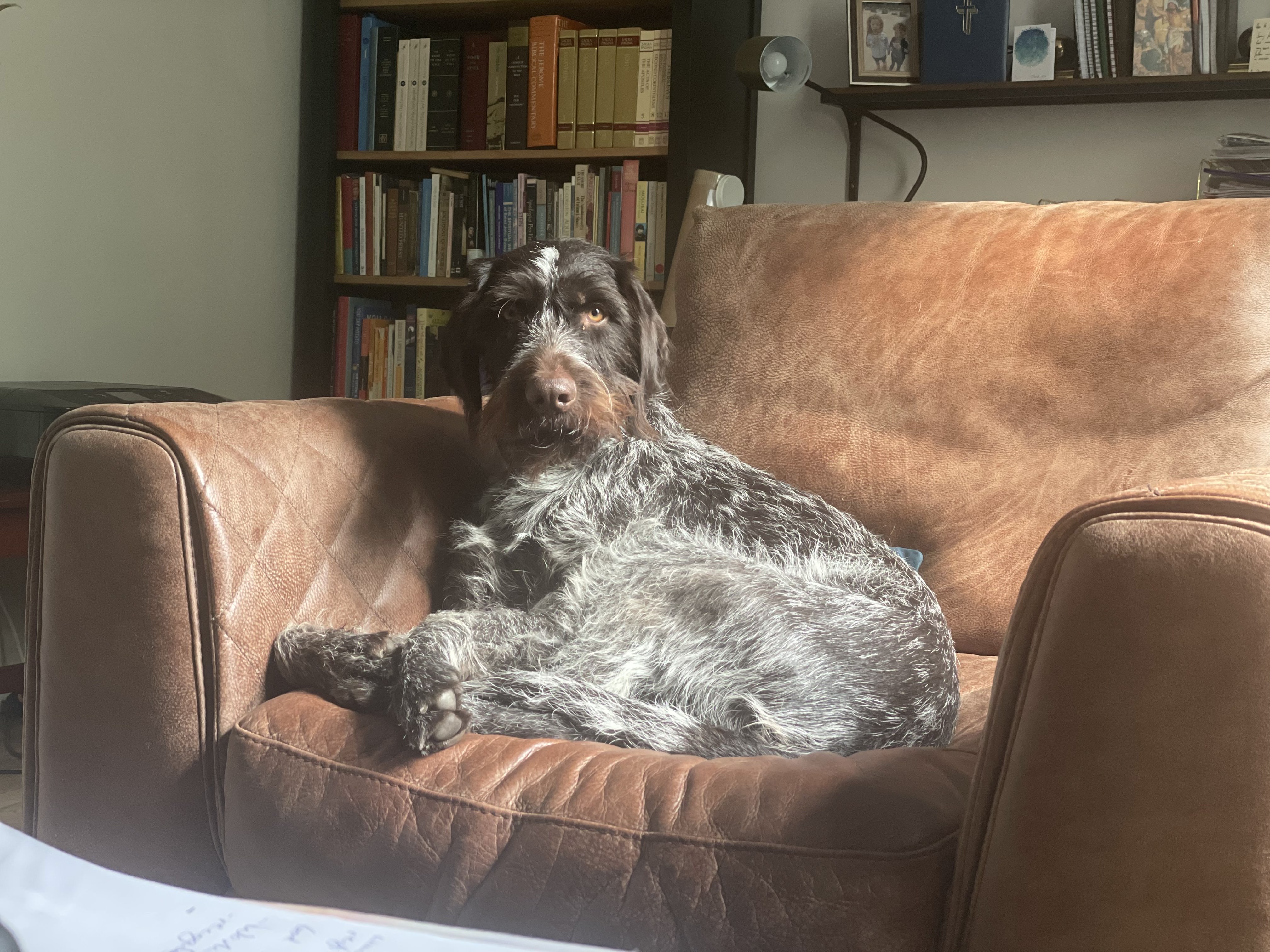 Wilf is a every bit a German Wirehaired Pointer - ticking all of the boxes you might expect from his breed. A short summary would be to say he is 'a lot of dog'. He doesn't just curl up in the corner out of sight and mind.