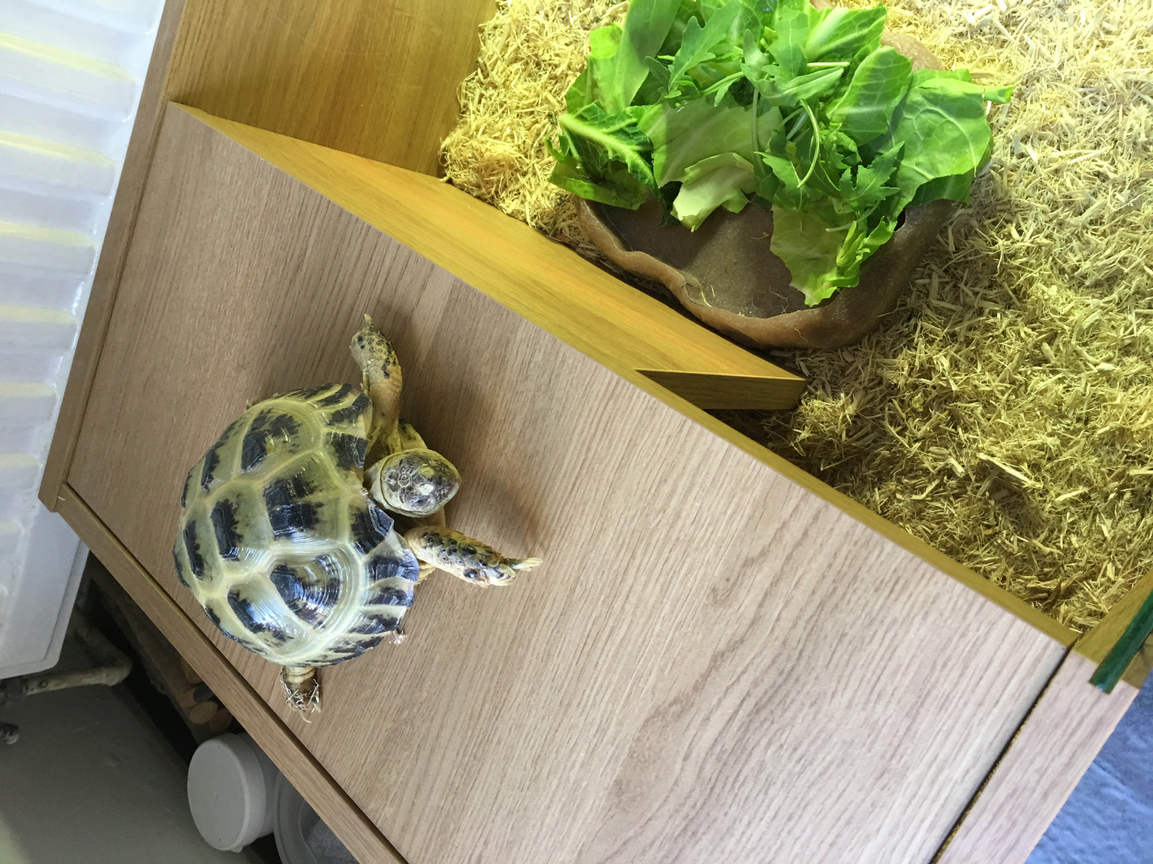 The Tortoise itself is very healthy and energetic with loads of personality. It loves cabbage and rocket and very easy to look after. We do not know the sex as it is too young yet to determine.