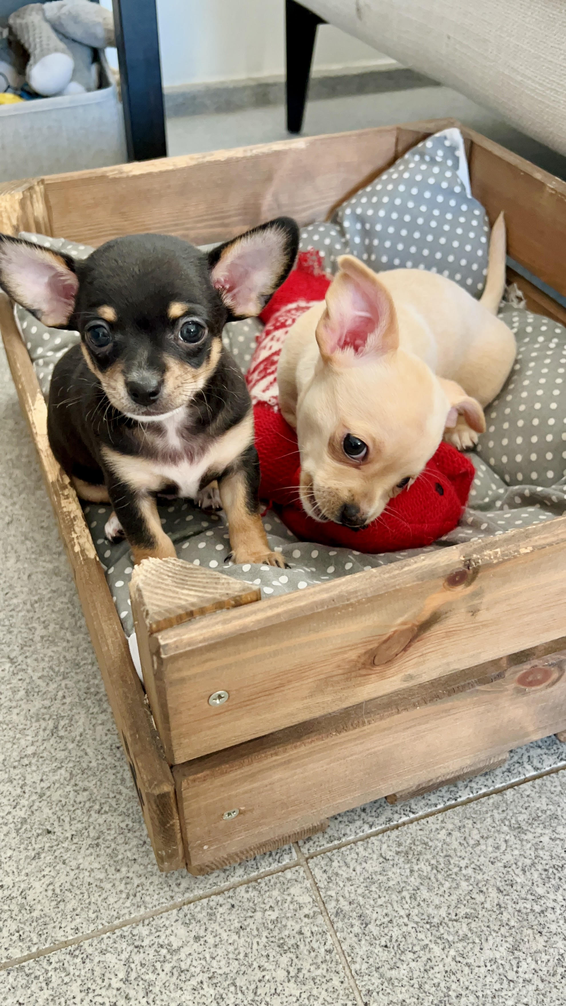 Mom is a Chiweenie (in a photo) from a registered breeder in Cornwall and dad is a white pedigree Chihuahua from Spain.