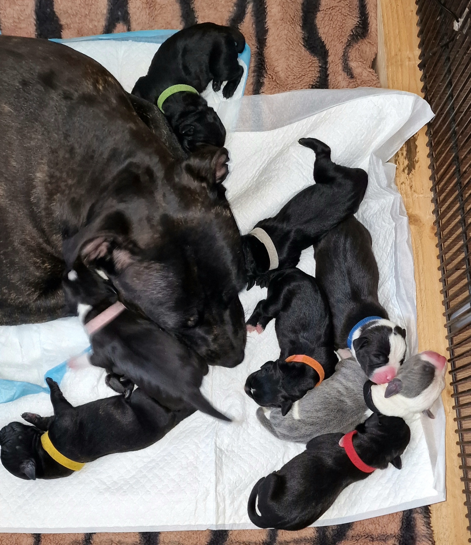 Hi our family dog Luna have 8 beautiful puppies, this her first litter, all puppies healthy born at 8 march, they eat well from mother, dad are typical blue staffy long legged, both parents are happy and friendly dogs, puppies will have their first vet visit soon for all they are need vaccine etc, little dogs should be ready for new homes after 3rd may, please contact for more info and pictures. thanks