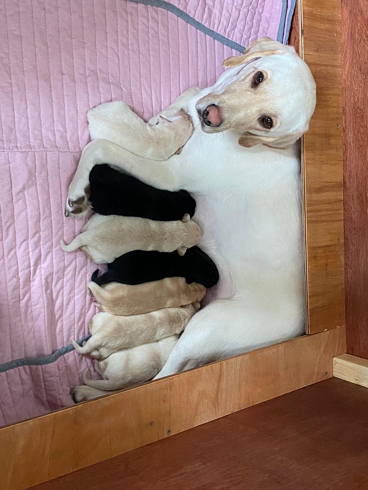Babs and the father Raymond are both from working strains with Raymond being KC registered however Babs is not, Babs has a excellent caring and gentle temperament and is very white in colour with Raymond being chocolate leading to some beautiful little puppies,