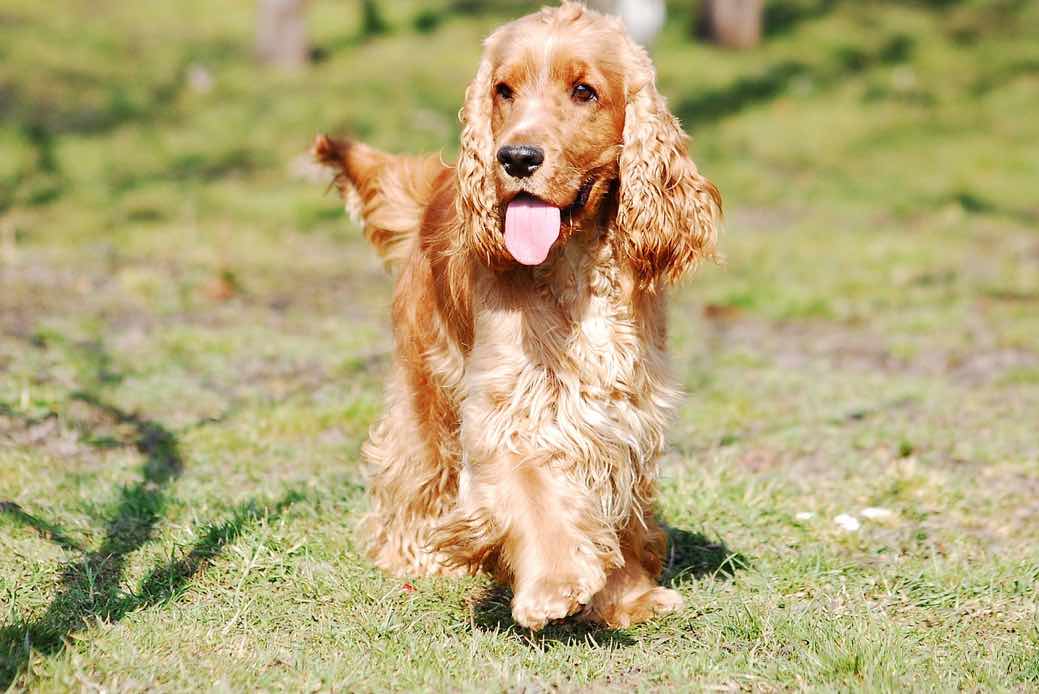 The Cocker Spaniel is a true English dog belonging to the gun dog group. It is an active, friendly and intelligent breed and one of several types of spaniel closely related to the Field Spaniel and the Springer Spaniel. It is an enthusiastic breed especially when working in the field and a relentless wagging tail will show how much this breed enjoys flushing and retrieving game. It has a compactly built proportion with a softly contoured head without sharp angles. The slightly oval, medium-sized eyes are set wide apart and dark brown in colour which adds to the overall soft yet alert and intelligent expression of the breed. The lobular ears are feathered, set low the head and should reach the tip of the nose when pulled forward. It has an arched and slightly flattened head when seen from the side with a definite but moderate stop, a well-cushioned muzzle that is cleanly chiselled under the eyes and strong jaws with scissors bite teeth capable of carrying game. The nostrils are wide – typical of scent hounds, black or brown depending on coat colour. It has a muscular, arching neck that goes well with the shoulder and backline that slopes very slightly toward a gently rounded croup. The tail is carried horizontally but may be carried higher when the dog is excited. The front legs are straight with uniform size bones from elbow to heel. The hindquarters have broad and muscular thighs with round and catlike feet with thick pads. It has fine, short hair on the head and medium length, flat or slightly wavy, silky hair on the body and ears, with featherings on the legs. Coat colours are black, liver, shades or red, and parti-colours. A typical adult male has a height of 41 cm to 43 cm while a female stands between 38 cm to 41 cm at withers. Weight varies between 13 kg to 16 kg for males and 12 kg to 14.5 kg for females.